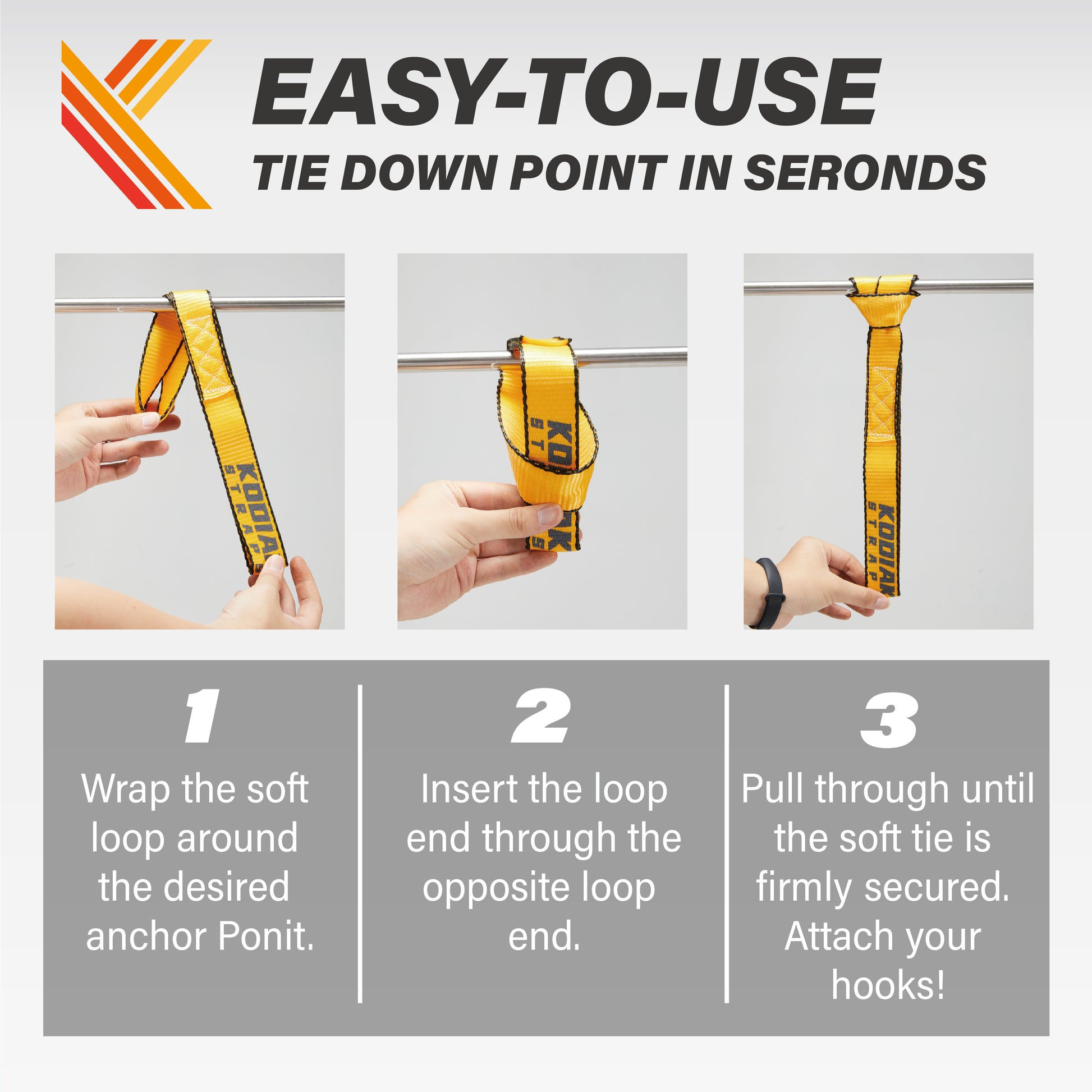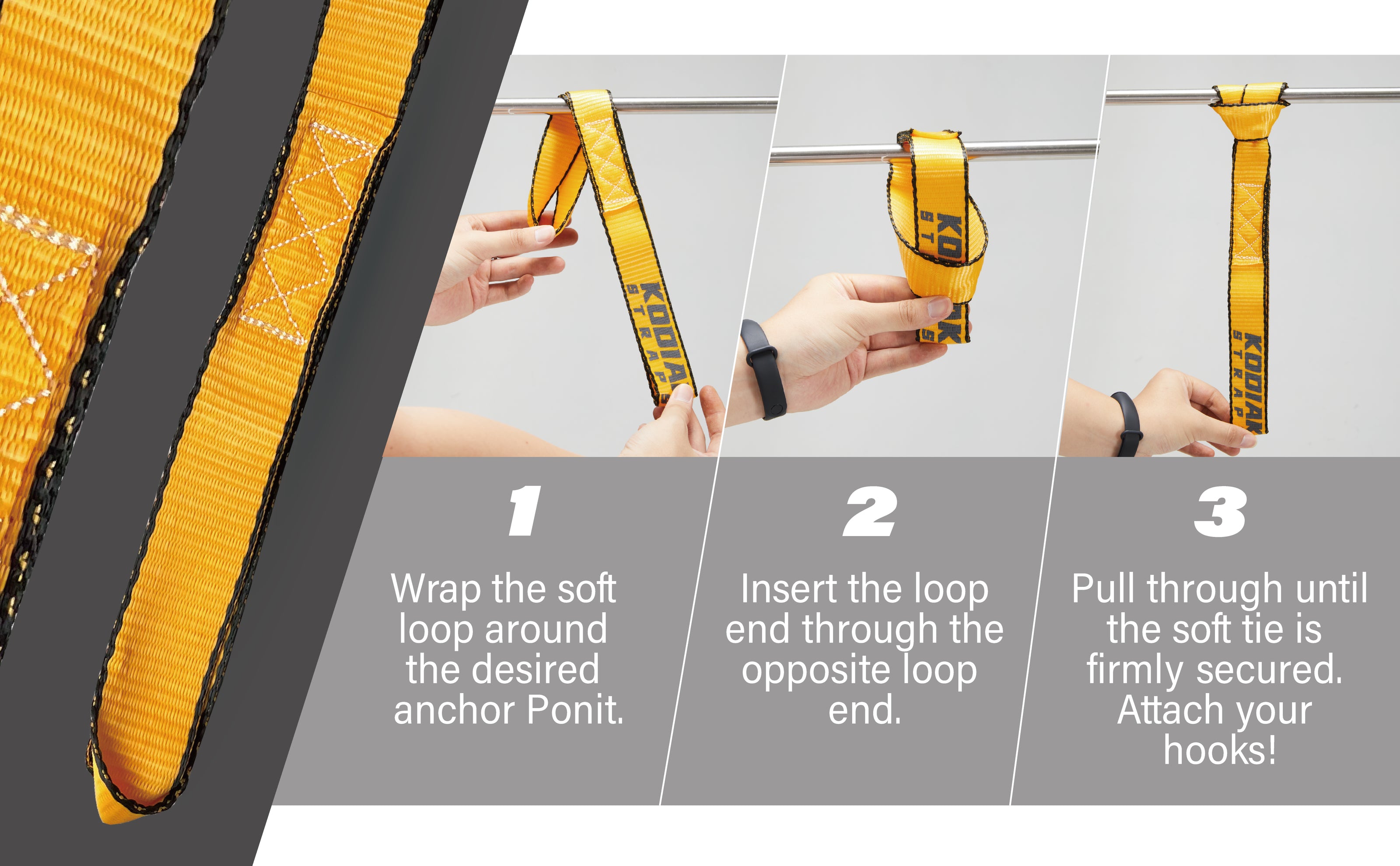 - EASY TO USE — These soft loops are a easy to use with any tie down. Simply cinch the soft loop and hook the tie-down to it instead of a bare equipment frame. EASY and NO MORE SCRATCHES!
