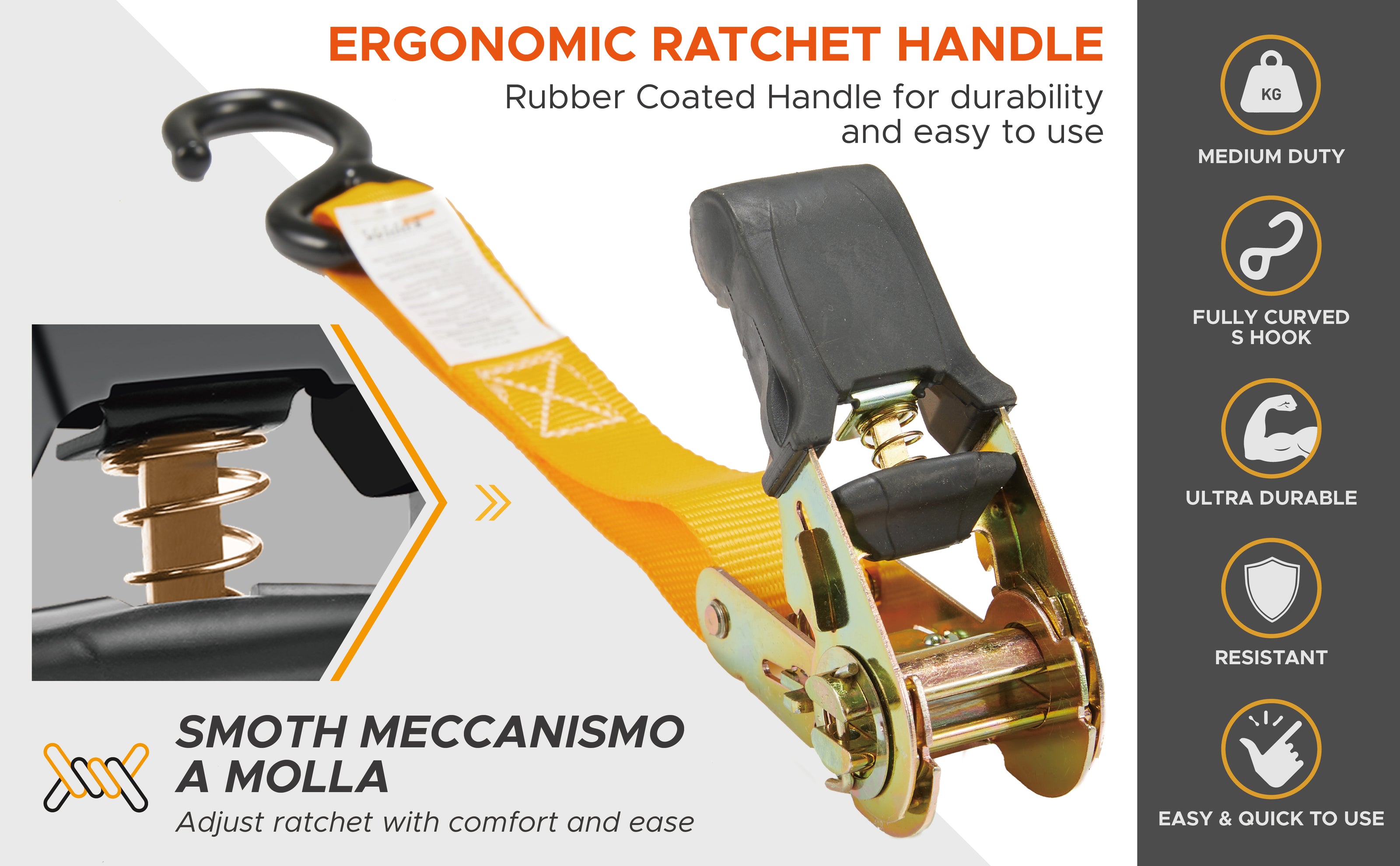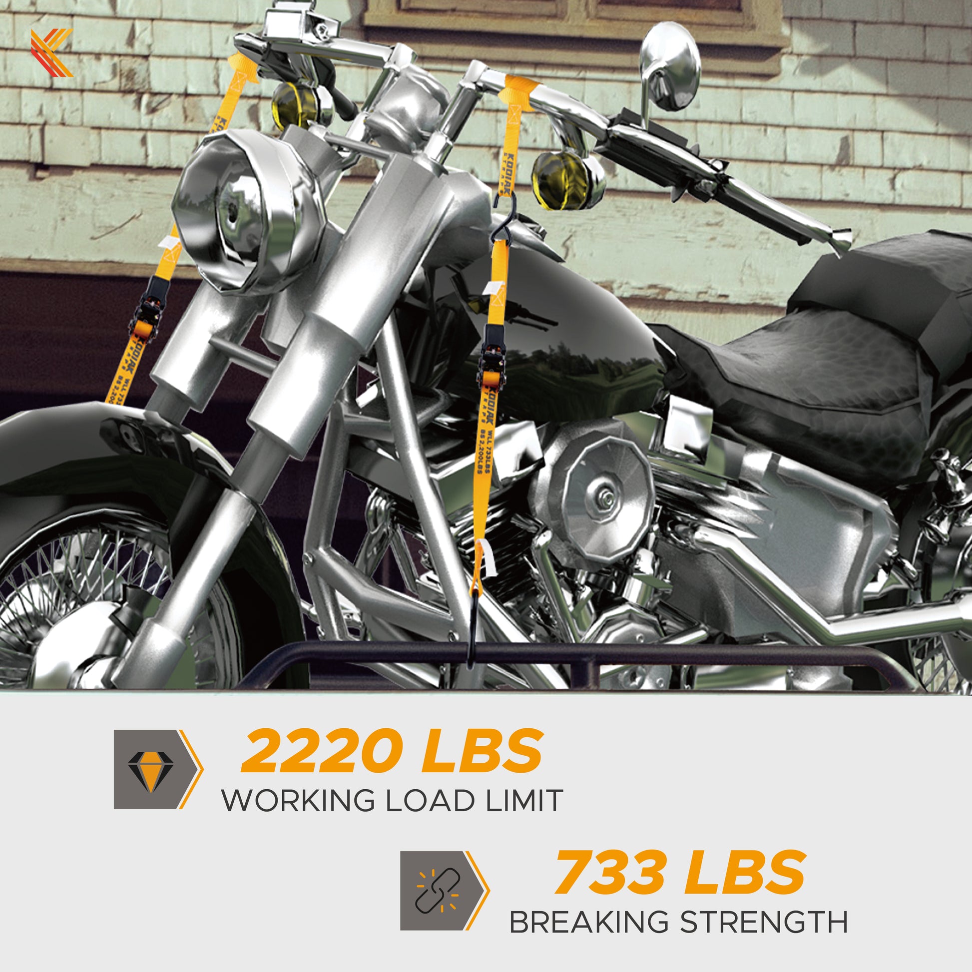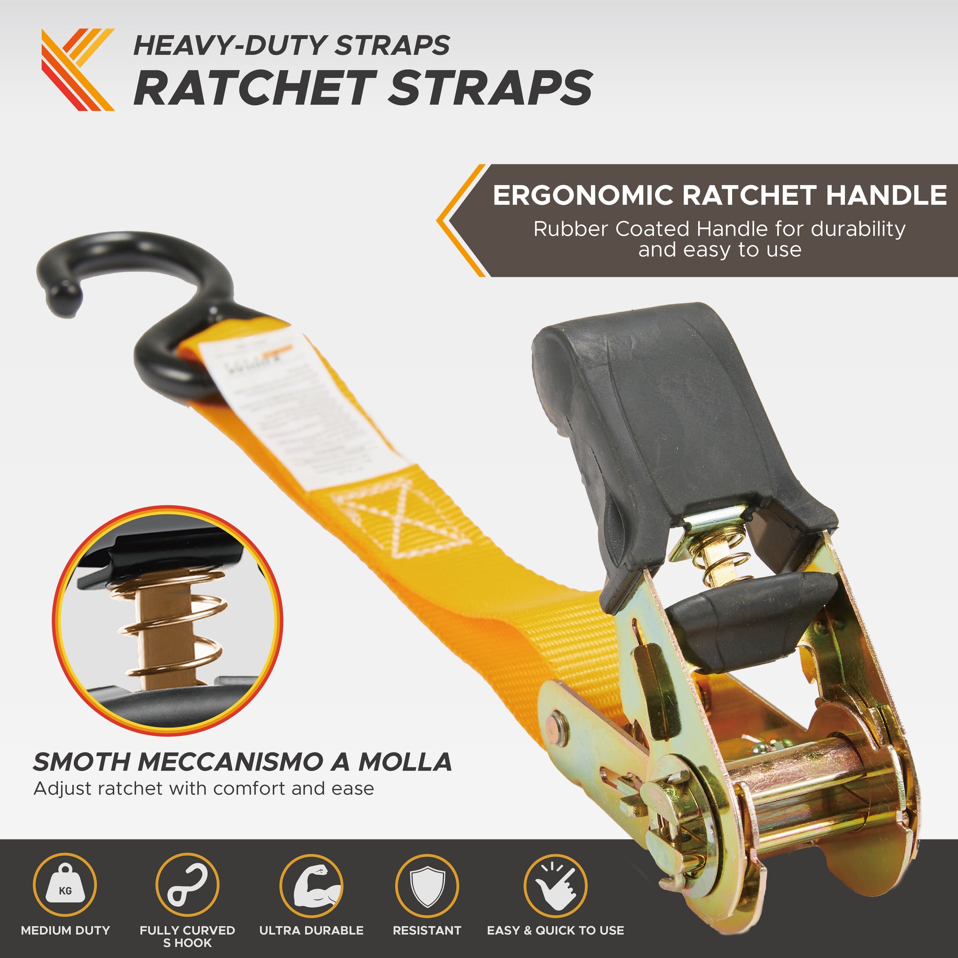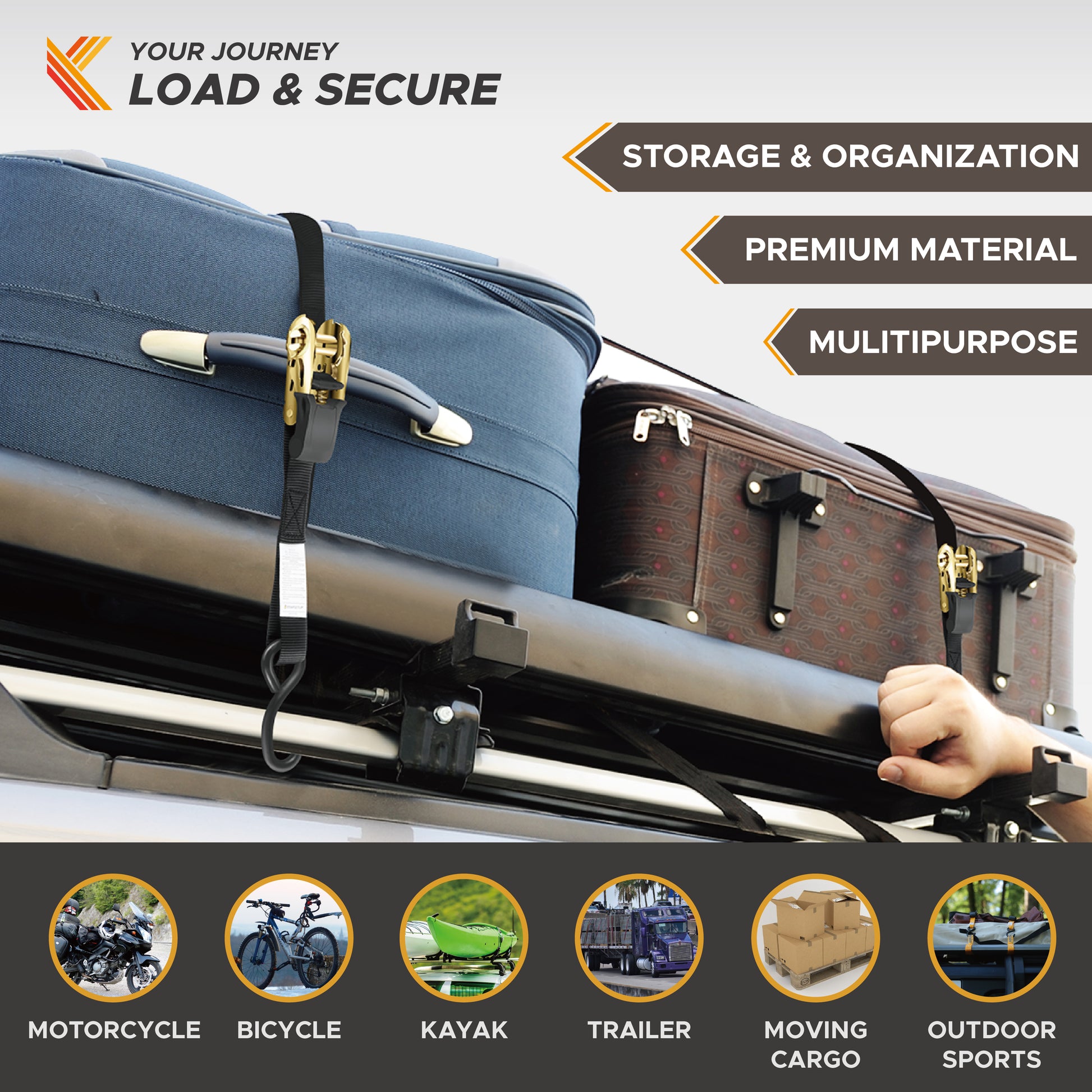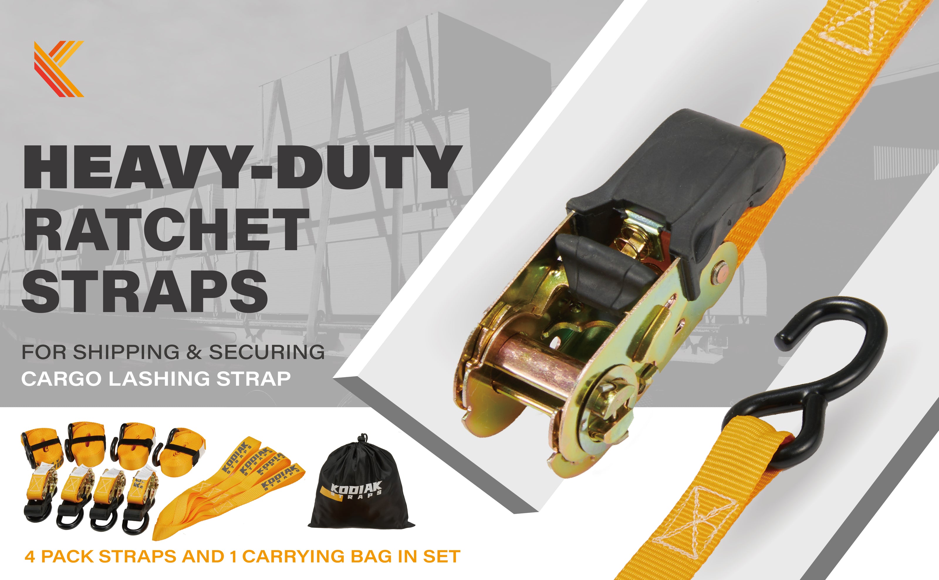 - 4 PACK RATCHET STRAPS– You get a set of 4 ratchet tie down straps with complete accessories to tie down cargo securely. Use the cargo straps to secure heavy loads for transport such as motorcycles, furniture, heavy equipment, machinery and other large items.