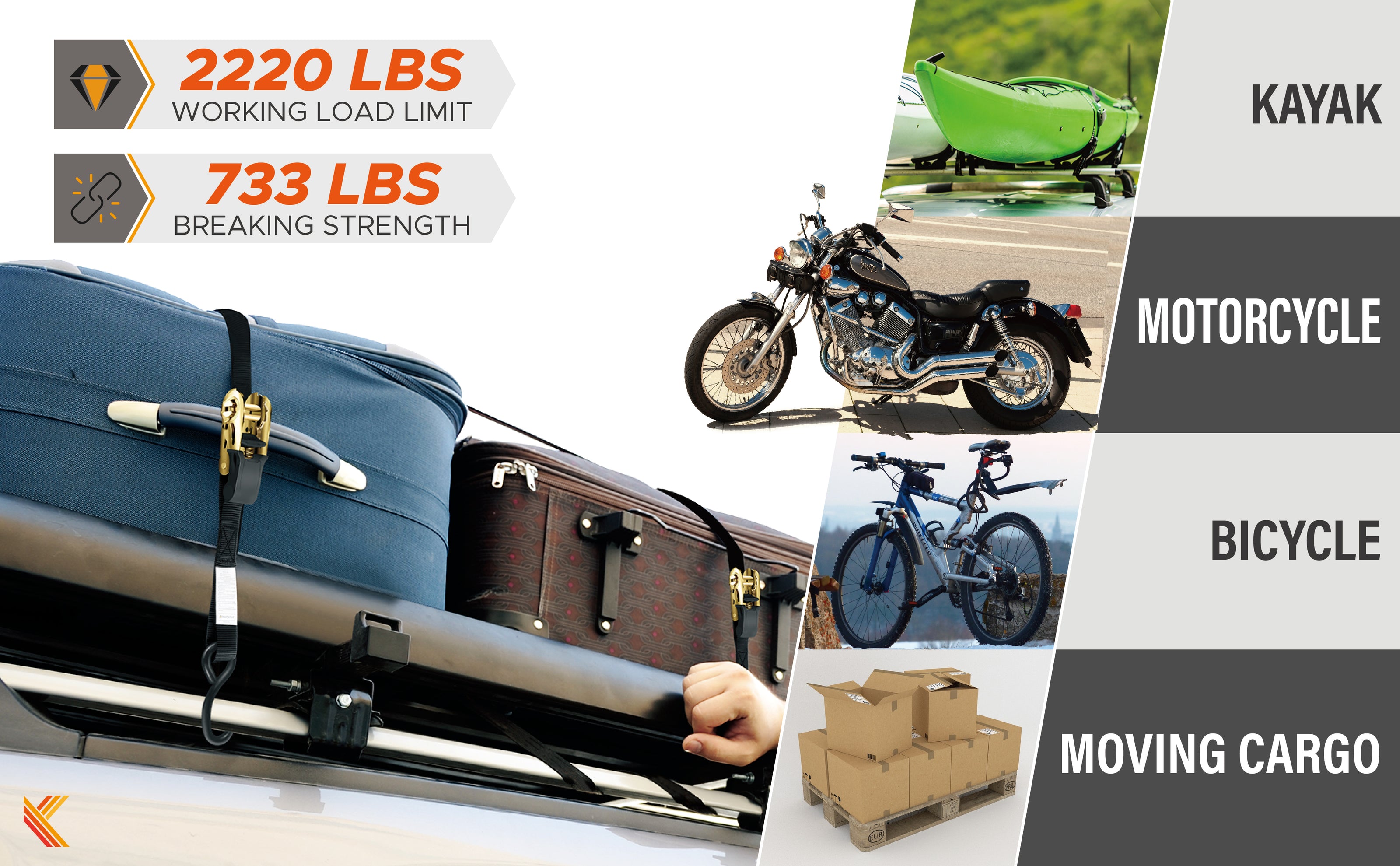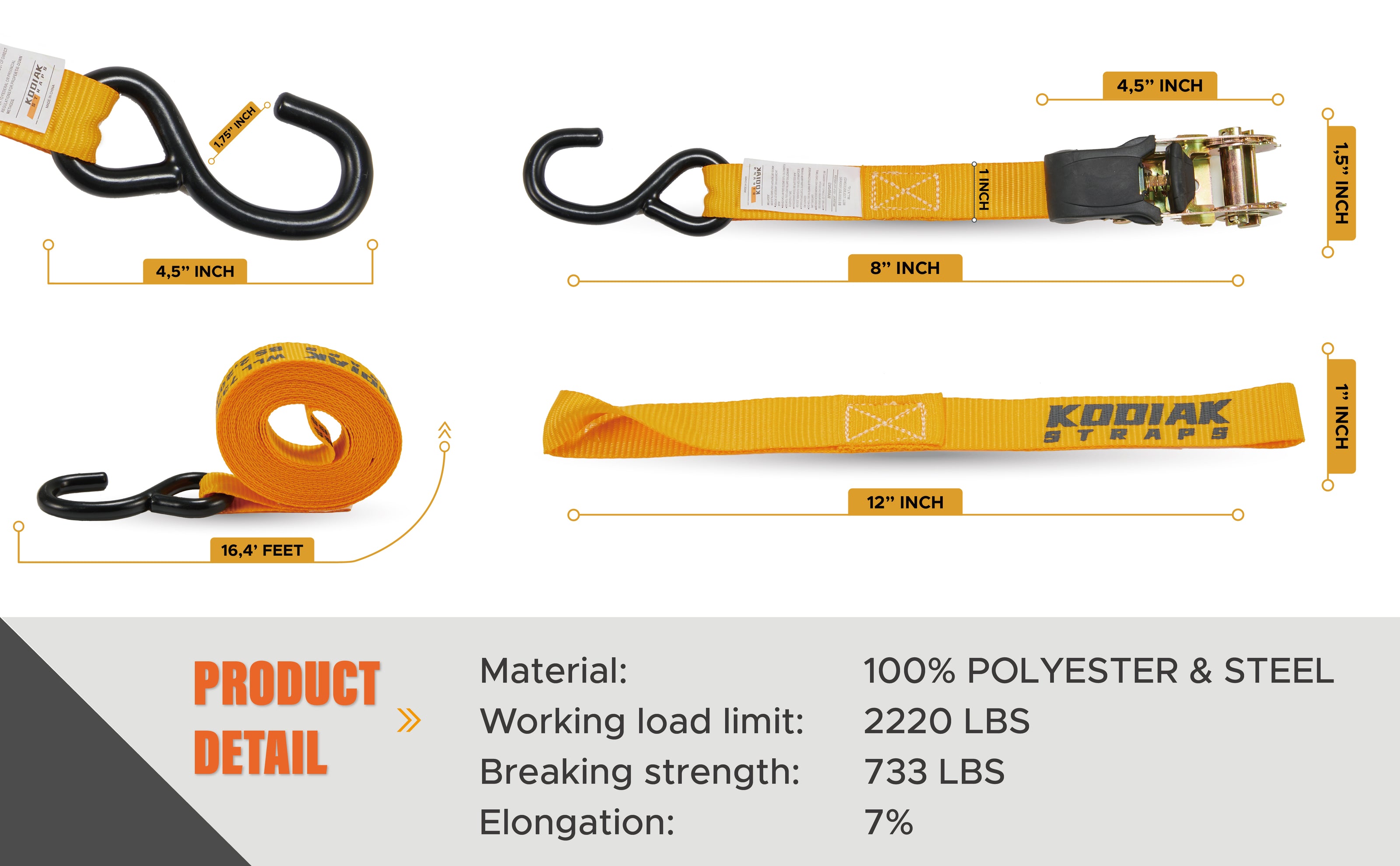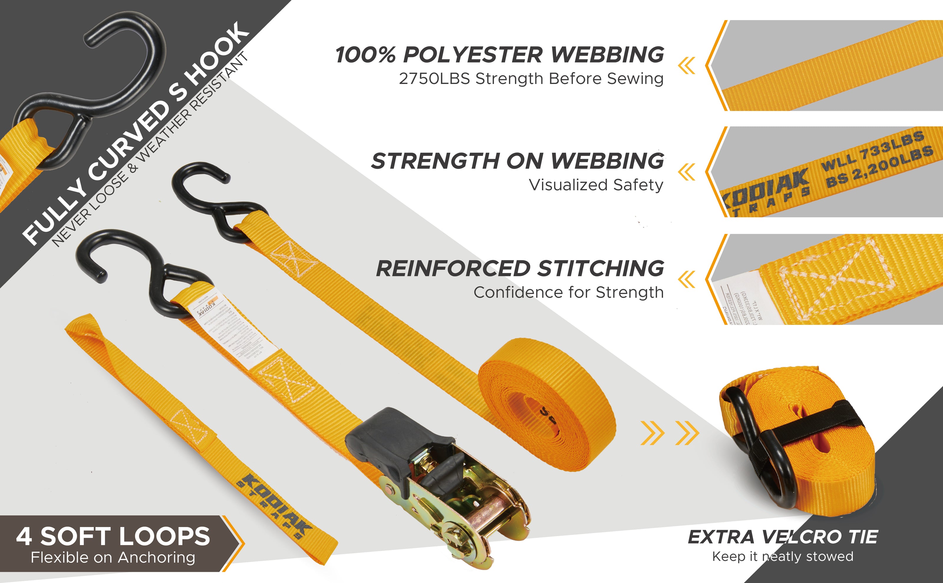 - 2200 LBS STRENGTH – Heavy duty rachet tiedowns straps for trucks and cargo are made from 100% polyester webbing that is rated for a working load of 733 lbs. and a minimum breaking strength of 2200 lbs. The truck straps feature printed load limits so you can tie down your loads with complete confidence and use them as cargo straps ratcheting or for tie downs for truck bed.