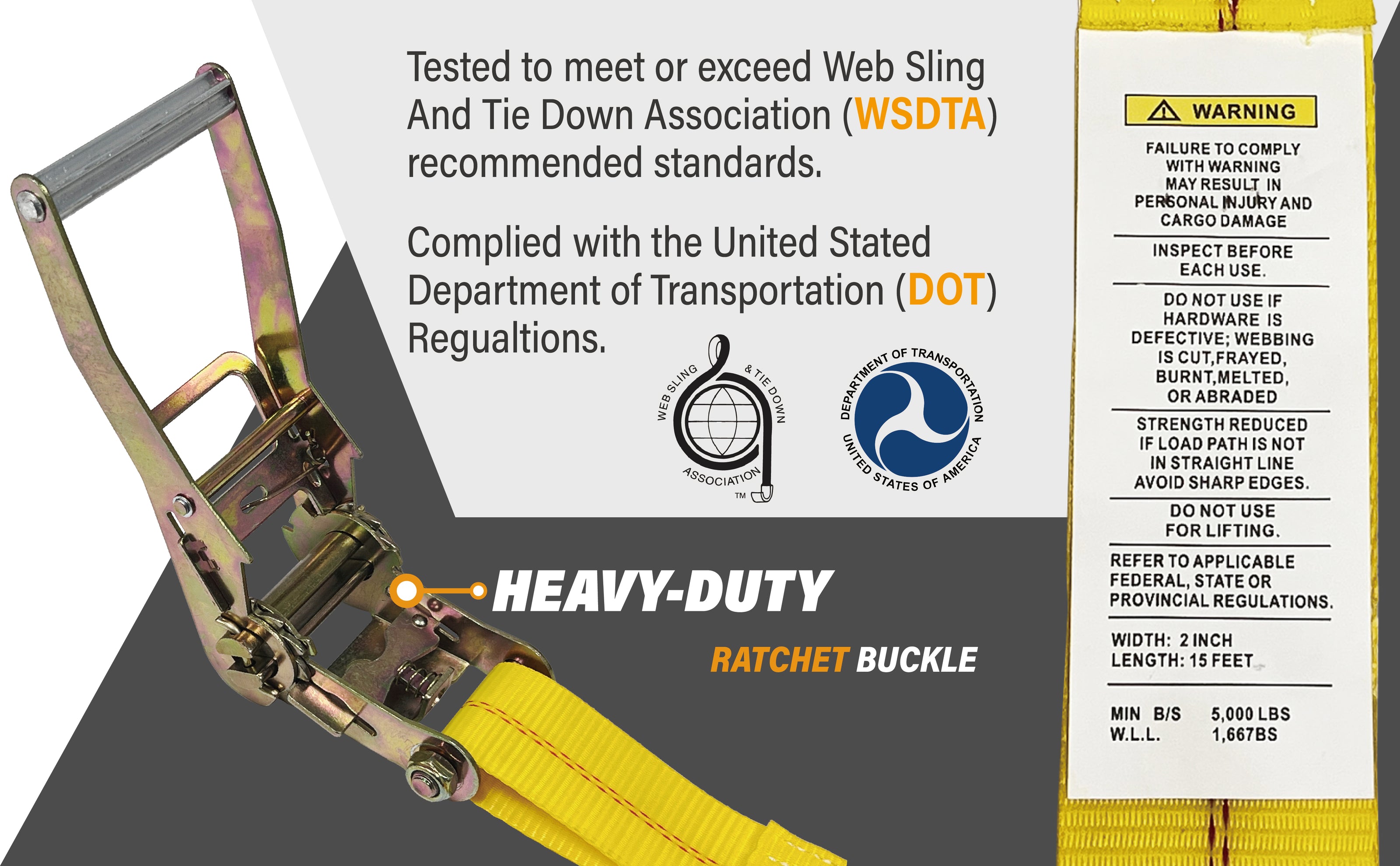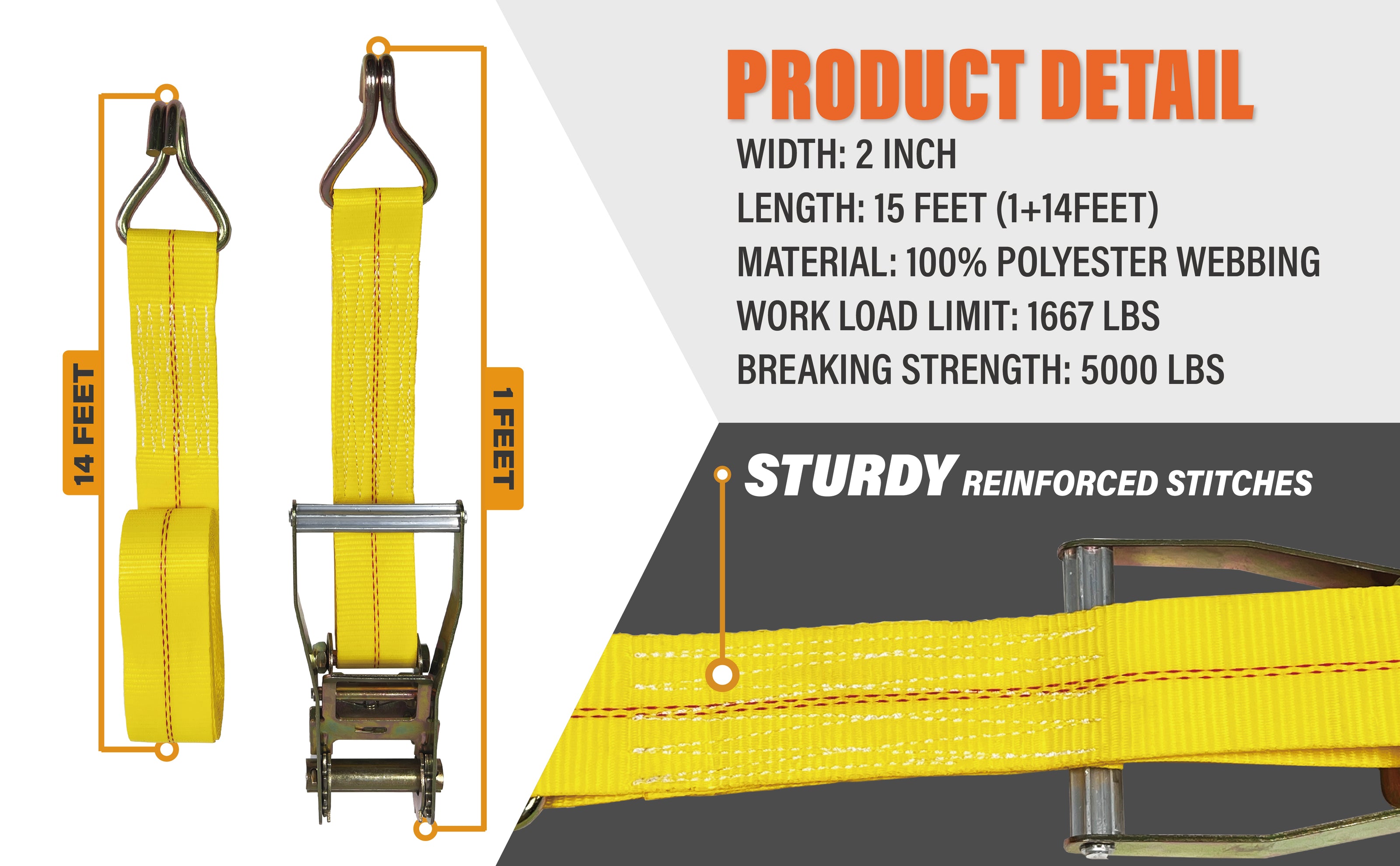 - WLL 1667LBS/ BS 5000 LBS — Our ratchet straps are constructed of rugged and zinc-coated steel and high-tenacity, heavy duty polyester webbing, providing a working load limit of 1667lbs and a minimum breaking strength of 5000lbs.