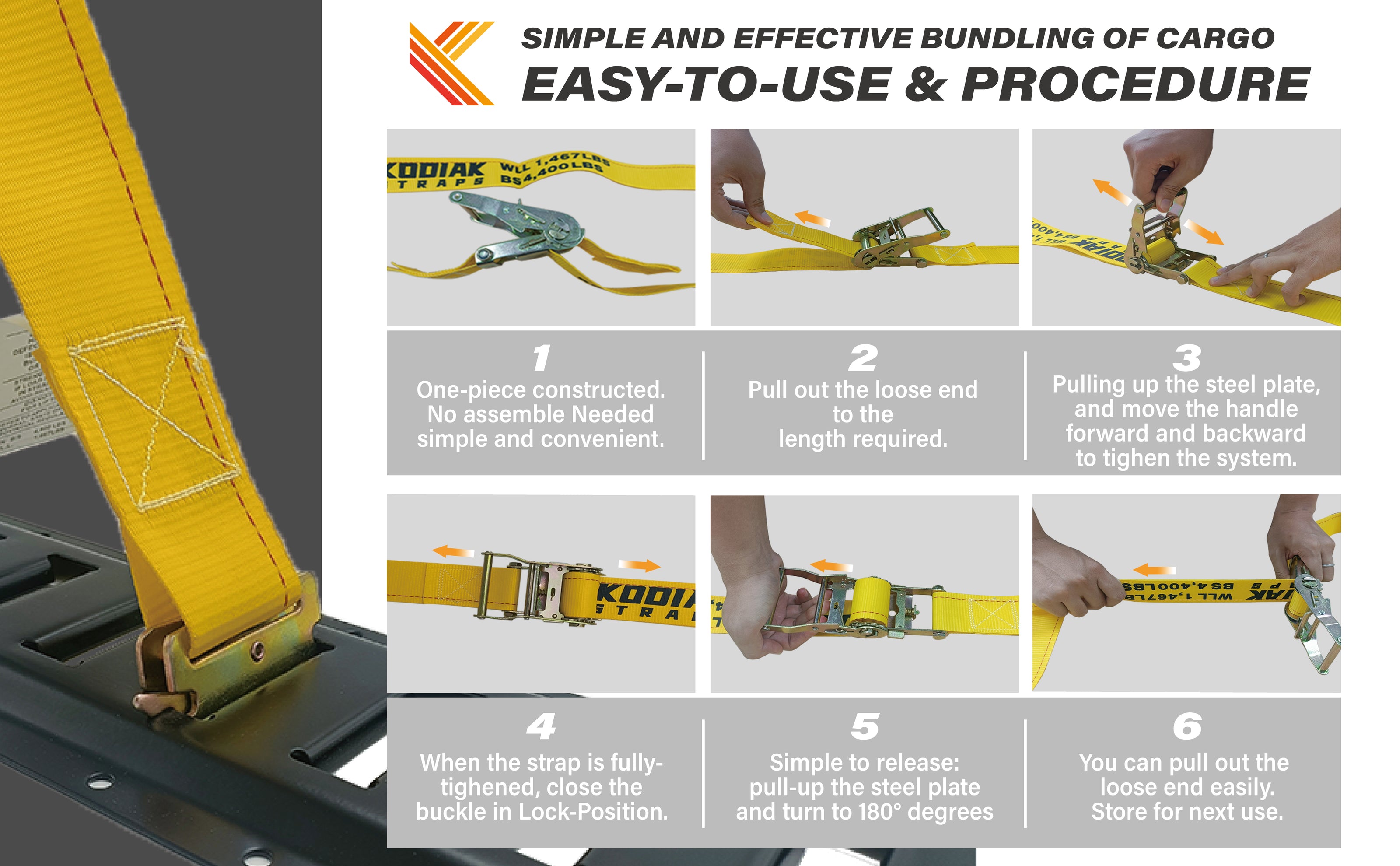 - EASY TO USE — 1. Open the e track ratchet strap by lifting the lever and threading the loose strap end around the bottom rod of the spindle (ratchet handle) 2. Pull the excess webbing through and pump the strap tight until it is wrapped securely around your cargo load 3. Clip the lever down and your load is secure!